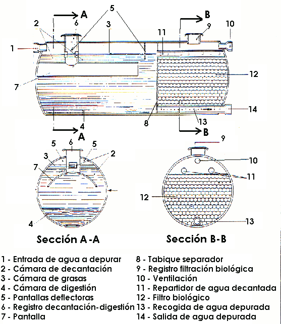 El proceso de depuración corresponde a un tratamiento fisico por decantación del agua residual y una estabilización anaerobia por digestión de los fangos, realizado en un reactor compacto con tres compartimientos interconectados y diferenciados:
