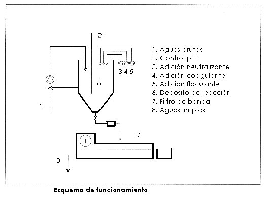 Finalizado el tratamiento, todo el contenido del reactor pasa por un filtro de banda por gravedad, que actúa como decantador y filtro simultáneos, separando las aguas tratadas de todos los contaminantes, que quedan sobre la banda, formando torta.