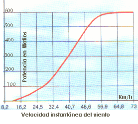 El generador eólico de la derecha, puede dar una potencia según el gráfico de abajo más de 600 watios en momentos de fuerte viento, pero con menores velocidades como 30 Km/h (muy corrientes en el campo, durante más de 8 horas) su potencia es de 150 watios. En las condiciones indicadas, un pequeño generador de este tipo produce al día 1,2 KWh. |